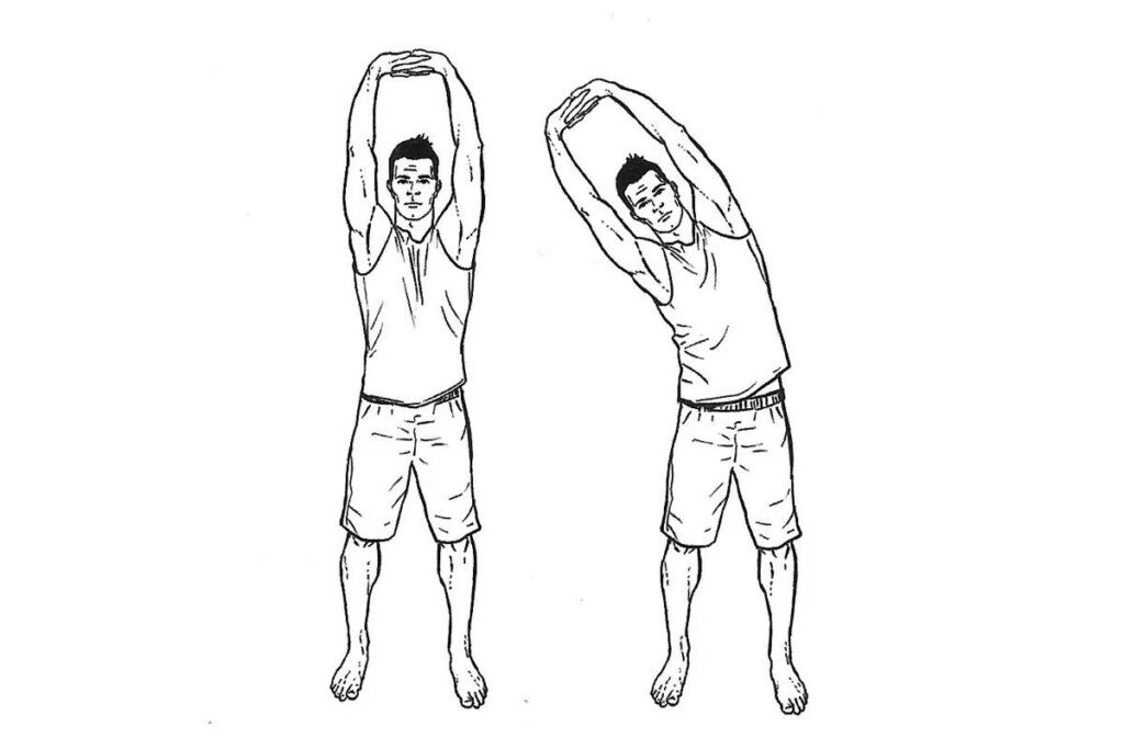 Tehnică: Stai drept, cu picioarele depărtate la nivelul umerilor. Ridică brațele, împletește degetele și întoarce palmele spre tavan. Întinde-te lent în sus, ridicându-te ușor pe vârfuri. Nu-ți ține respirația. Menține poziția timp de 3–5 respirații lente. Coboară brațele și repetă de trei ori.