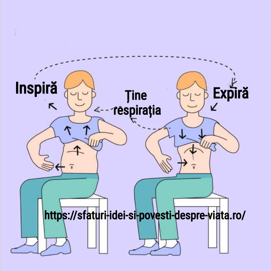 Inspirați – în număr de unu, doi, trei și expirați – în același număr. Faceți un total de trei sau patru inspirații la rând. În a doua săptămână, faceți patru sau cinci respirații la rând, dacă este dificil, reveniți la ritmul inițial. În a treia săptămână, măriți durata respirației până la o numărare de patru. Creșteți durata respirației o dată la două săptămâni până la un număr de șase (inspirați și expirați de șase ori).
