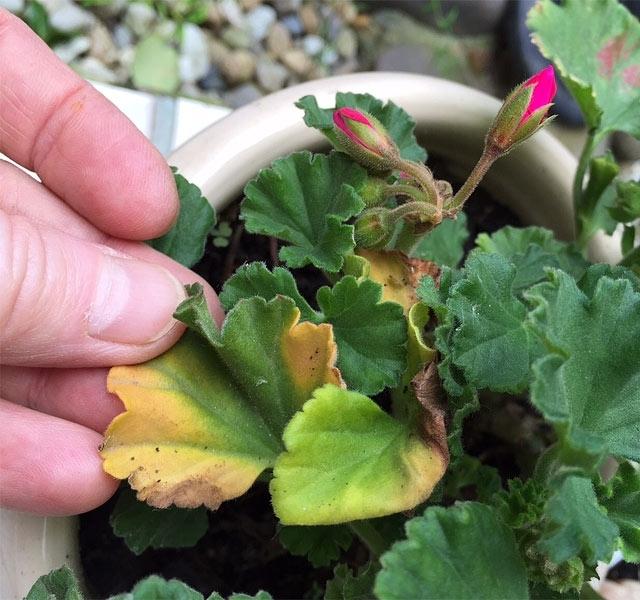 Când umiditatea este mare și ați dat din greșeală prea multă apă mușcatei, frunzele acesteia se vor îngălbeni în continuare. Nu udați câteva zile, doar când solul este aproape uscat.
