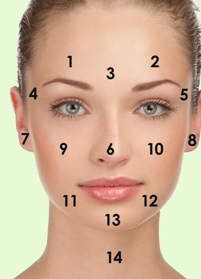 Harta facială..Fiecare zonă corespunde unuia sau mai multor organe vitale din corp.