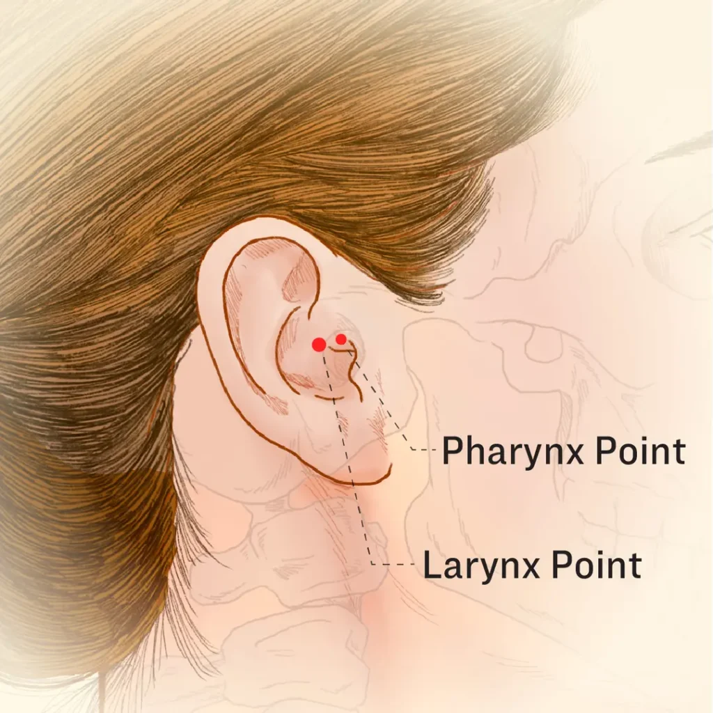 Hu a recomandat masajul a două puncte de acupunctură ale urechii – punctul faringian și punctul laringian. Punctul faringian este situat chiar deasupra canalului auditiv, la ora 12, iar punctul laringian se află în apropiere, la ora 10-11.Apăsați sau masați ușor aceste puncte de acupunctură timp de una până la trei minute. O ușoară durere sau sensibilitate indică plasarea corectă, iar masajul blând poate ajuta la ameliorarea rapidă a durerii în gât.