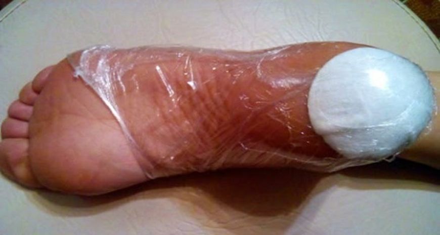 Apoi înfășurați călcâiul în folie alimentară și puneți o șosetă peste el. Se lasă să acționeze peste noapte.